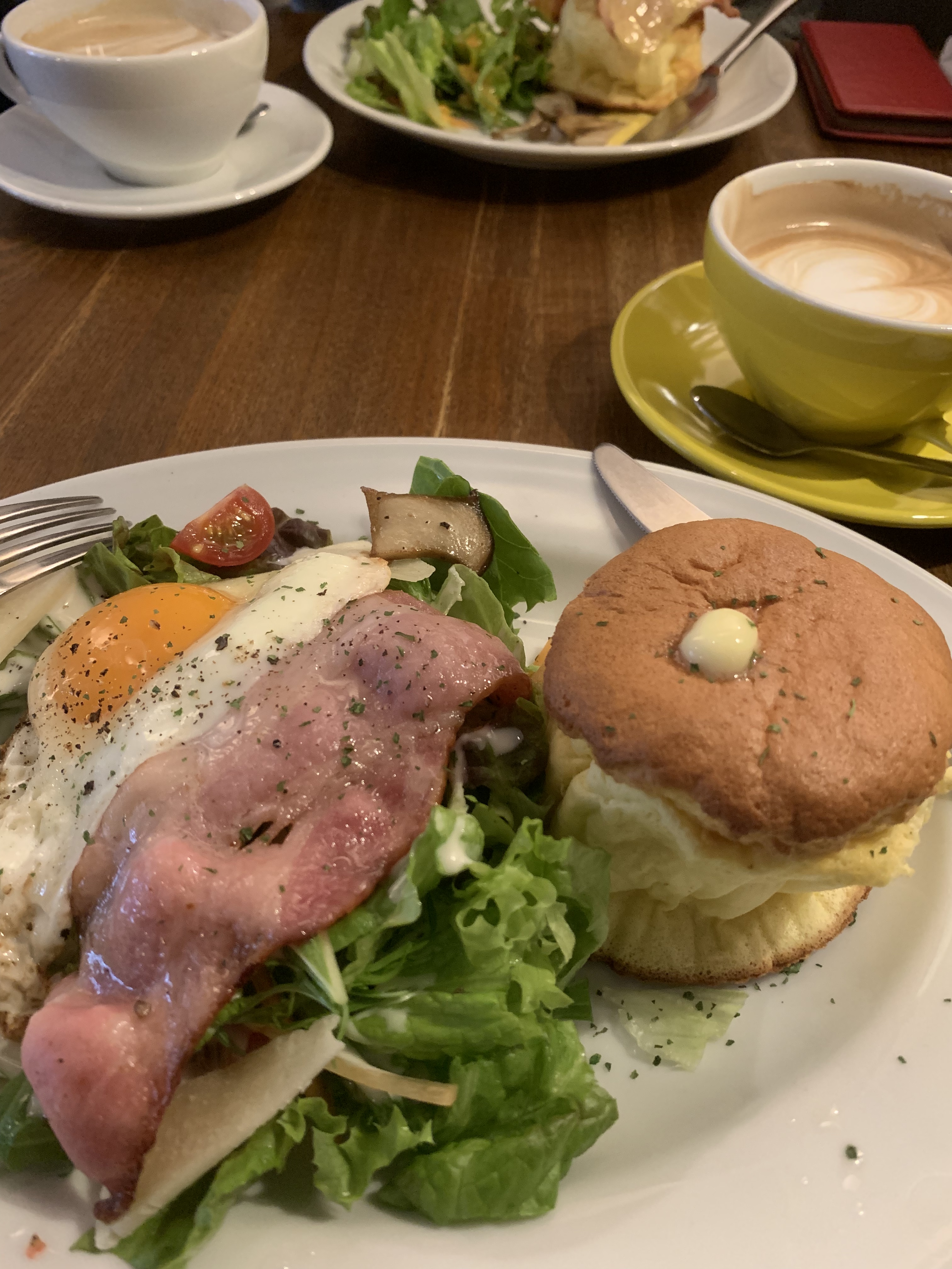 この日は ベーコンエッグシーザーサラダパンケーキ(長い!)にしましたー